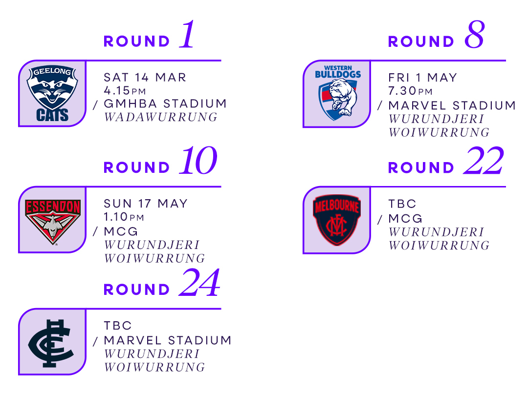 *Access up to eleven matches during the 2026 Toyota AFL Premiership Season in Melbourne. This access is made up of Freo's matches played in Melbourne, plus access to the AFL Reserve for additional non-Fremantle games played at the MCG to make up the eleven. Excludes the Anzac Day match at the MCG.